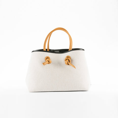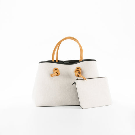 - Materials: Cotton 70% / Polyester 30%, Cow Leather 100%, Lining: Polyester 100%, Handle: Cow Leather 100%